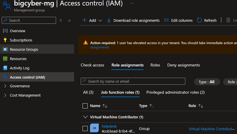 By navigating to our bigcyber management group and selecting the Activity Log blade, we can see all the logs generated by our actions in the group.